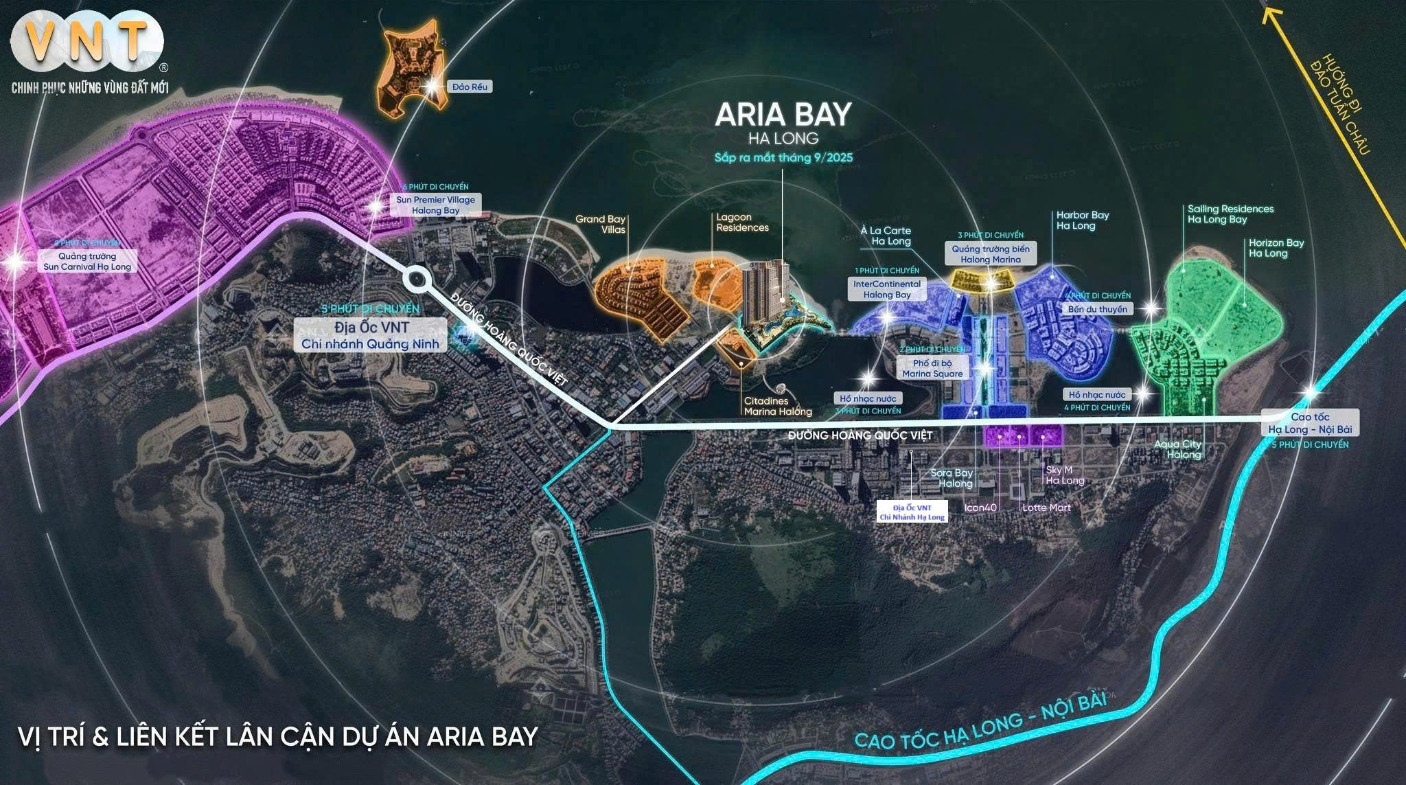 Tọa lạc ngay sát bến du thuyền quốc tế và kề bên tuyến phố bao biển huyết mạch, Aria Bay thừa hưởng vị trí không thể thay thế. Dự án nằm giữa hai trục giao thông trọng điểm: đường bao biển Hạ Long – Cái Dăm và đường Hoàng Quốc Việt kéo dài – tuyến kết nối trực tiếp tới cao tốc Hà Nội – Hải Phòng – Hạ Long.